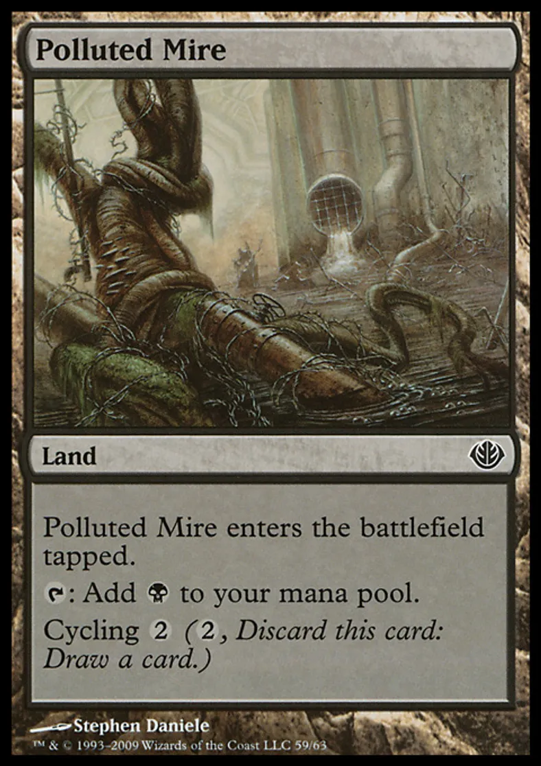 | Oracle Text | Polluted Mire enters the battlefield tapped. {{t}}: Add {{b}} to your mana pool. Cycling {{2}} ({{2}}, Discard this card: Draw a card.) | ||