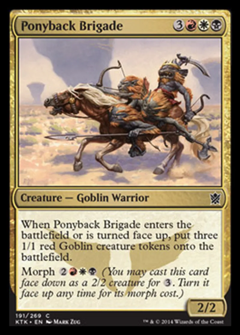 | Oracle Text | When Ponyback Brigade enters the battlefield or is turned face up, put three 1/1 red Goblin creature tokens onto the battlefield. Morph {{2}}{{r}}{{w}}{{b}} (You may cast this card face down as a 2/2 creature for {{3}}. Turn it face up any time for its morph cost.) | ||
