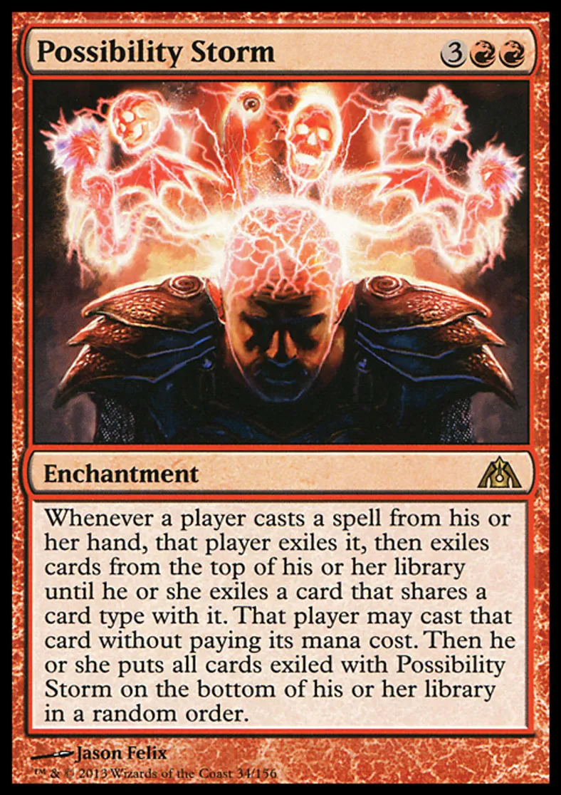 | Oracle Text | Whenever a player casts a spell from his or her hand, that player exiles it, then exiles cards from the top of his or her library until he or she exiles a card that shares a card type with it. That player may cast that card without paying its mana cost. Then he or she puts all cards exiled with Possibility Storm on the bottom of his or her library in a random order. | ||