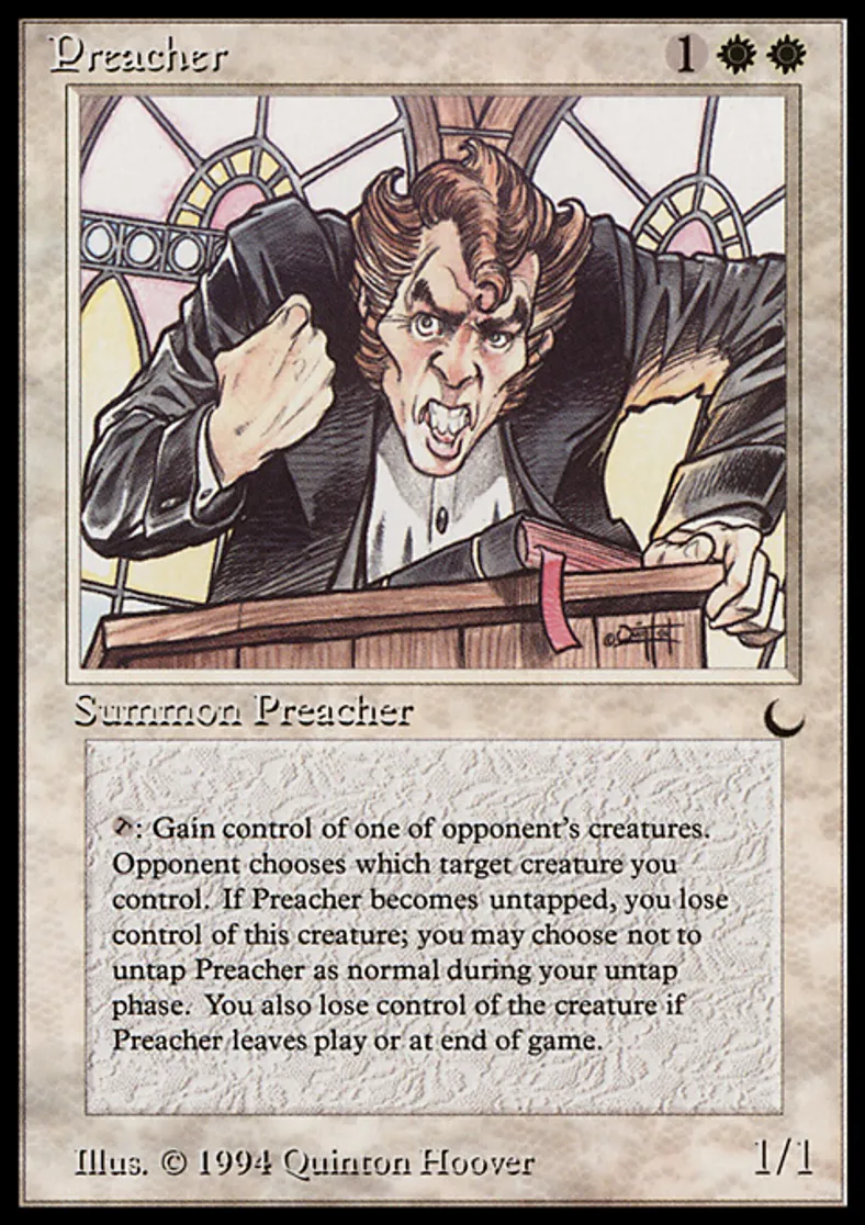 | Oracle Text | You may choose not to untap Preacher during your untap step. {{t}}: Gain control of target creature of an opponent's choice that he or she controls for as long as Preacher remains tapped. | ||