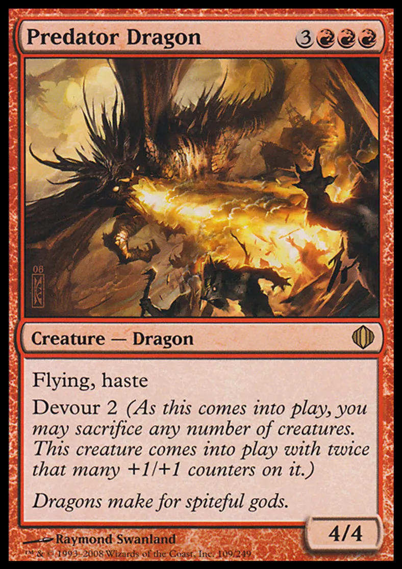 | Oracle Text | Flying, haste Devour 2 (As this enters the battlefield, you may sacrifice any number of creatures. This creature enters the battlefield with twice that many +1/+1 counters on it.) | ||