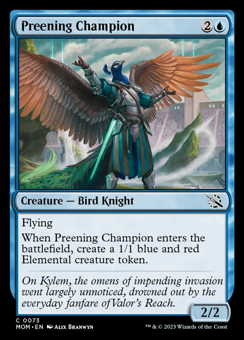 Magic: the Gathering (mtg) common Creature — Bird Knight Preening Champion from March of the Machine (mom) last updated 2026-02-21 16:22:32