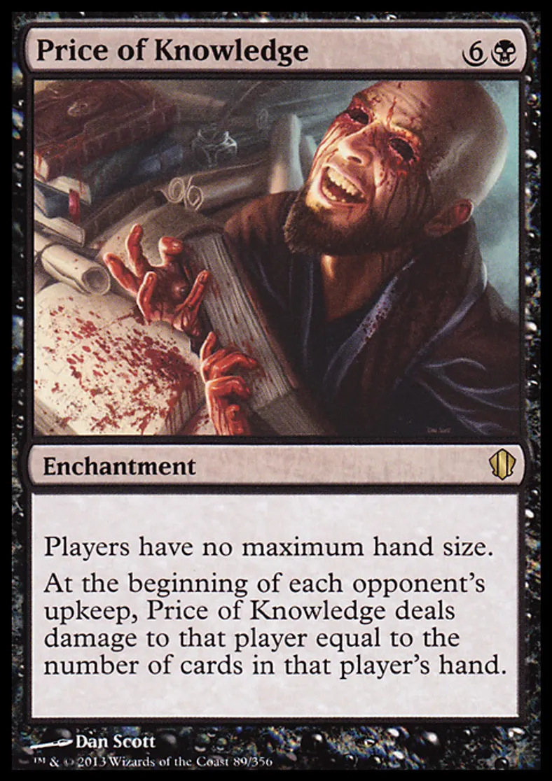 | Oracle Text | Players have no maximum hand size. At the beginning of each opponent's upkeep, Price of Knowledge deals damage to that player equal to the number of cards in that player's hand. | ||