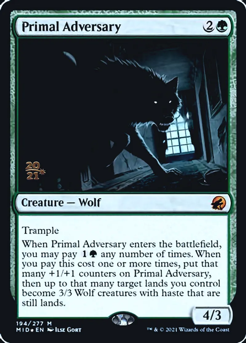 When Primal Adversary enters the battlefield, you may pay {{1}}{{g}} any number of times. When you pay this cost one or more times, put that many +1/+1 counters on Primal Adversary, then up to that many target lands you control become 3/3 Wolf creatures with haste that are still lands. | ||