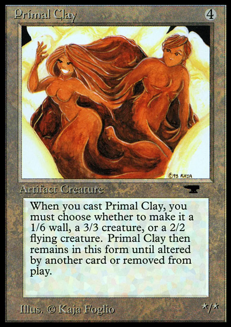 | Oracle Text | As Primal Clay enters the battlefield, it becomes your choice of a 3/3 artifact creature, a 2/2 artifact creature with flying, or a 1/6 Wall artifact creature with defender in addition to its other types. | ||