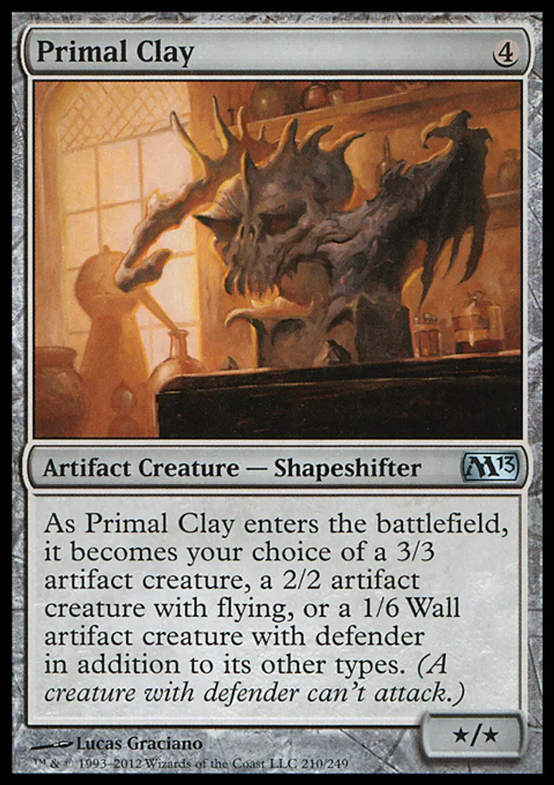 | Oracle Text | As Primal Clay enters the battlefield, it becomes your choice of a 3/3 artifact creature, a 2/2 artifact creature with flying, or a 1/6 Wall artifact creature with defender in addition to its other types. (A creature with defender can't attack.) | ||