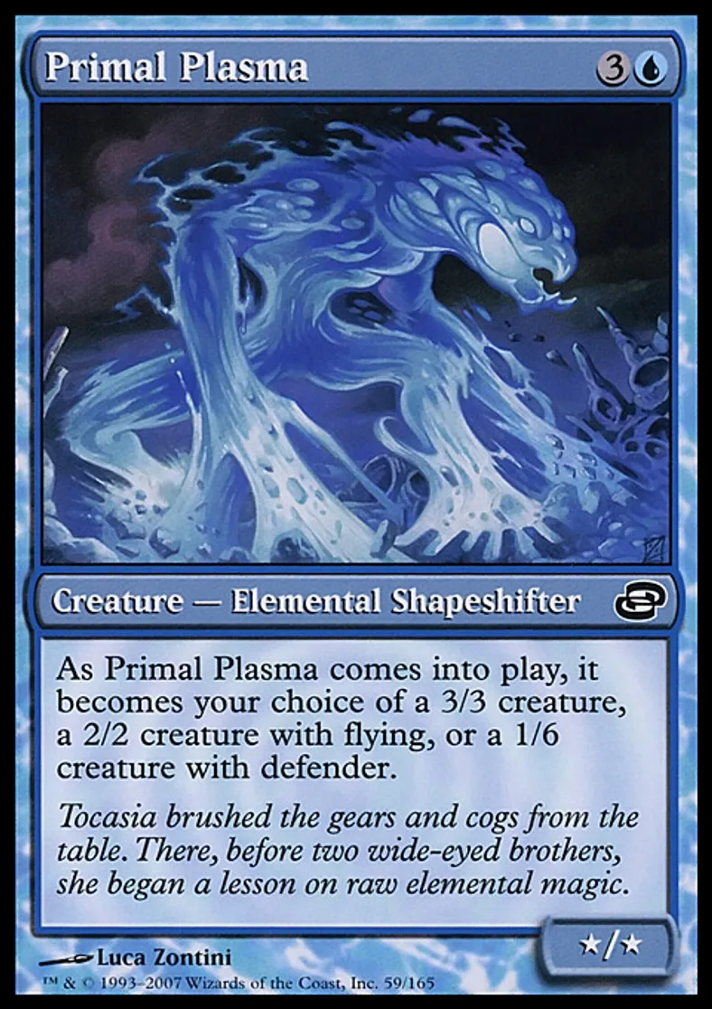| Oracle Text | As Primal Plasma enters the battlefield, it becomes your choice of a 3/3 creature, a 2/2 creature with flying, or a 1/6 creature with defender. | ||