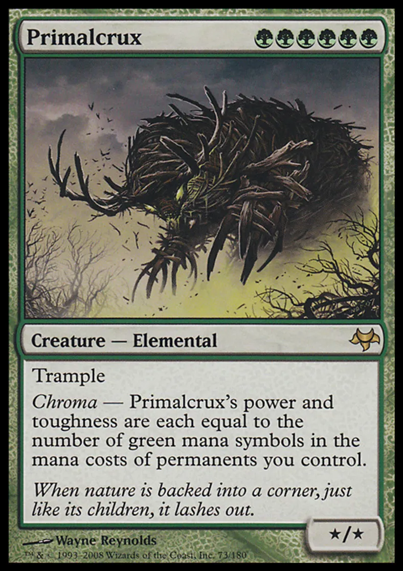| Oracle Text | Trample Chroma — Primalcrux's power and toughness are each equal to the number of green mana symbols in the mana costs of permanents you control. | ||