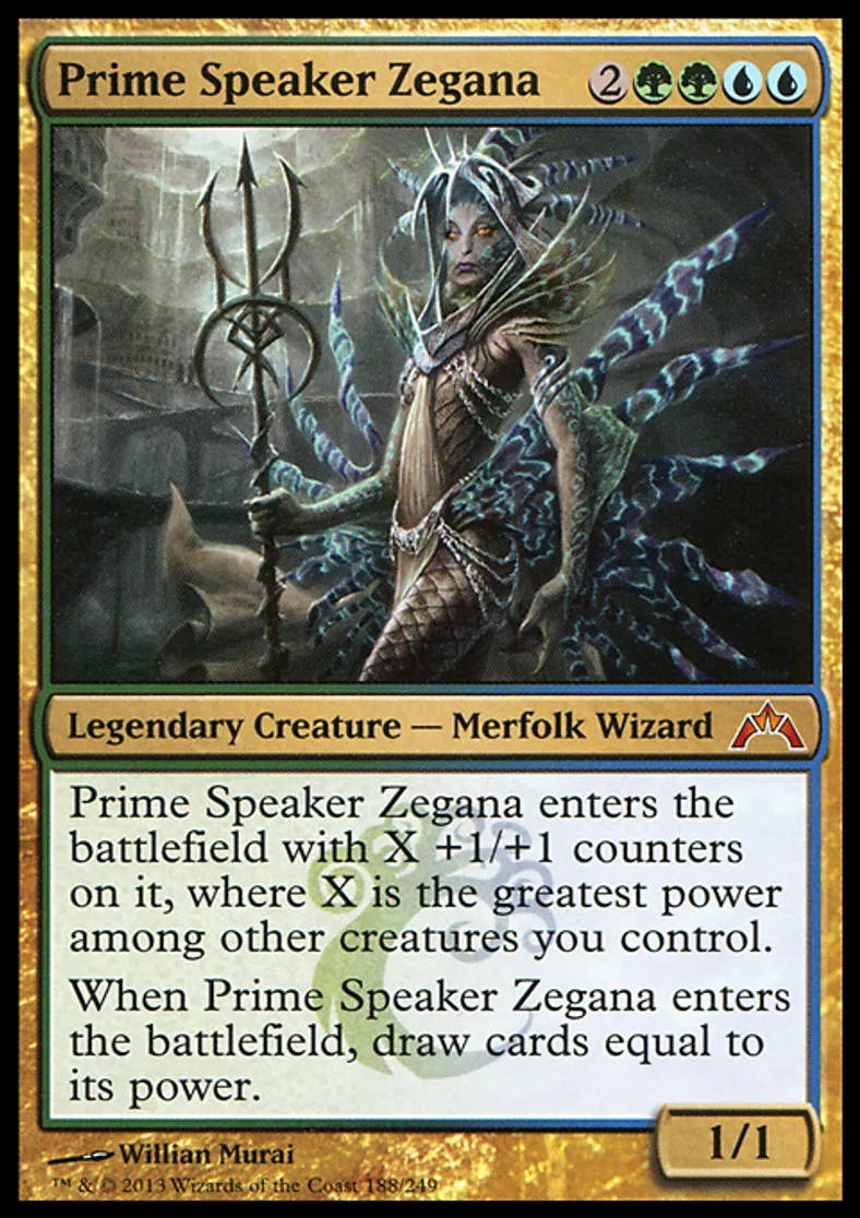 | Oracle Text | Prime Speaker Zegana enters the battlefield with X +1/+1 counters on it, where X is the greatest power among other creatures you control. When Prime Speaker Zegana enters the battlefield, draw cards equal to its power. | ||