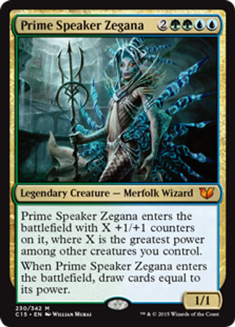 | Oracle Text | Prime Speaker Zegana enters the battlefield with X +1/+1 counters on it, where X is the greatest power among other creatures you control. When Prime Speaker Zegana enters the battlefield, draw cards equal to its power. | ||