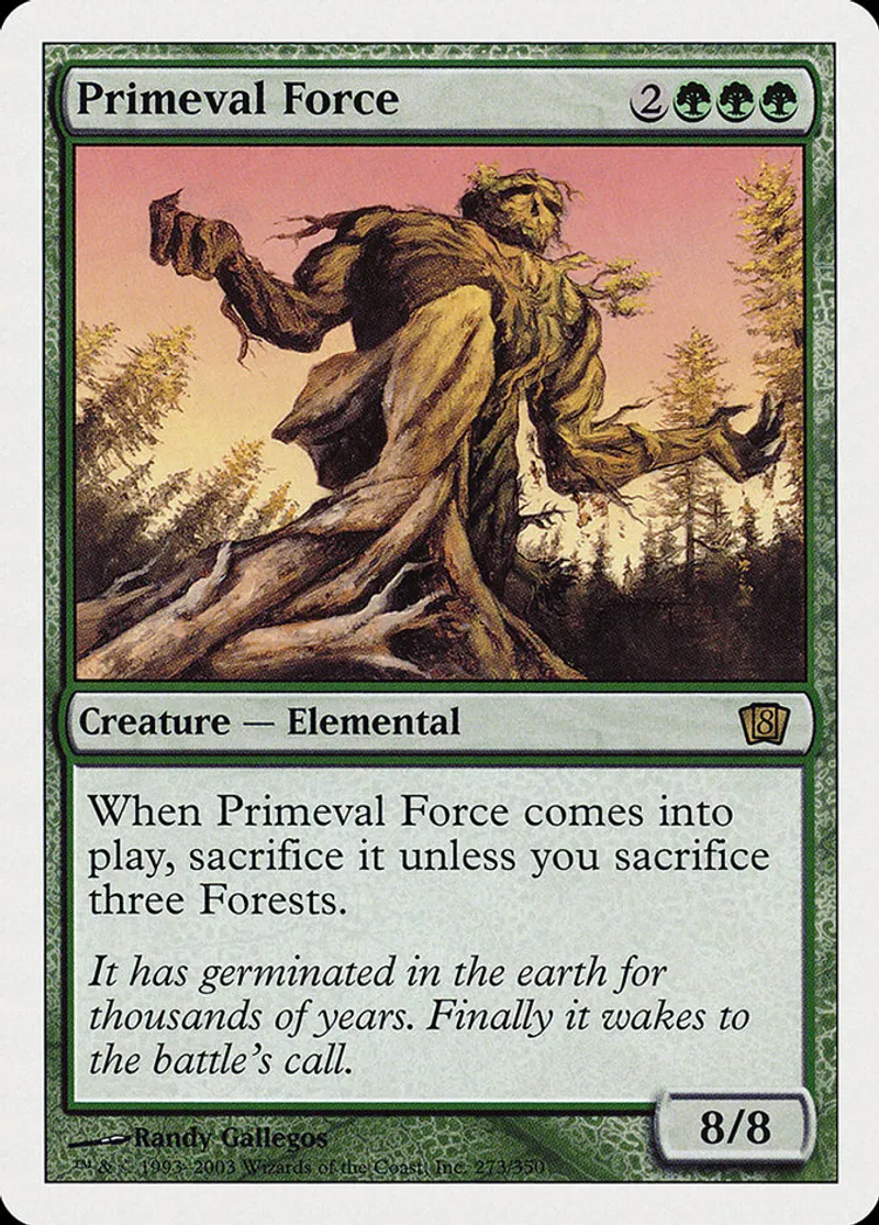 | Oracle Text | When Primeval Force enters the battlefield, sacrifice it unless you sacrifice three Forests. | ||