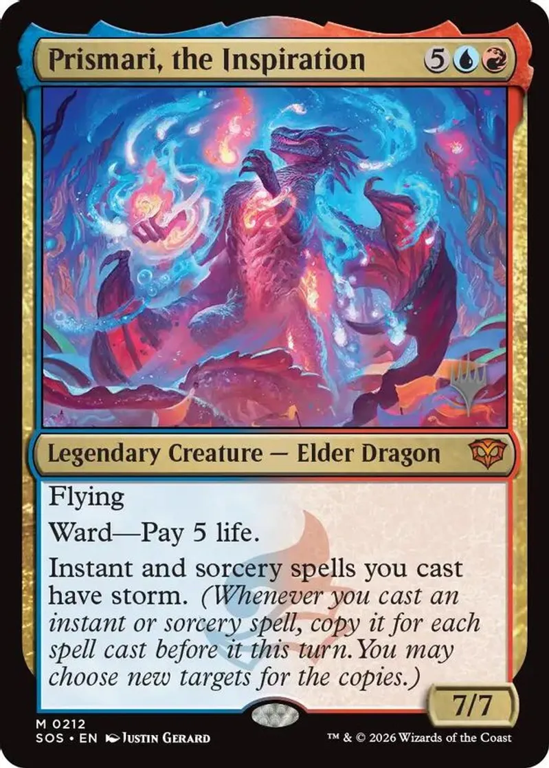 Magic: the Gathering (mtg) Mythic Rare legendary creature — elder dragon Prismari, the Inspiration from Promo Pack: Secrets of Strixhaven (PPSOS) last updated 2026-04-17 21:10:19