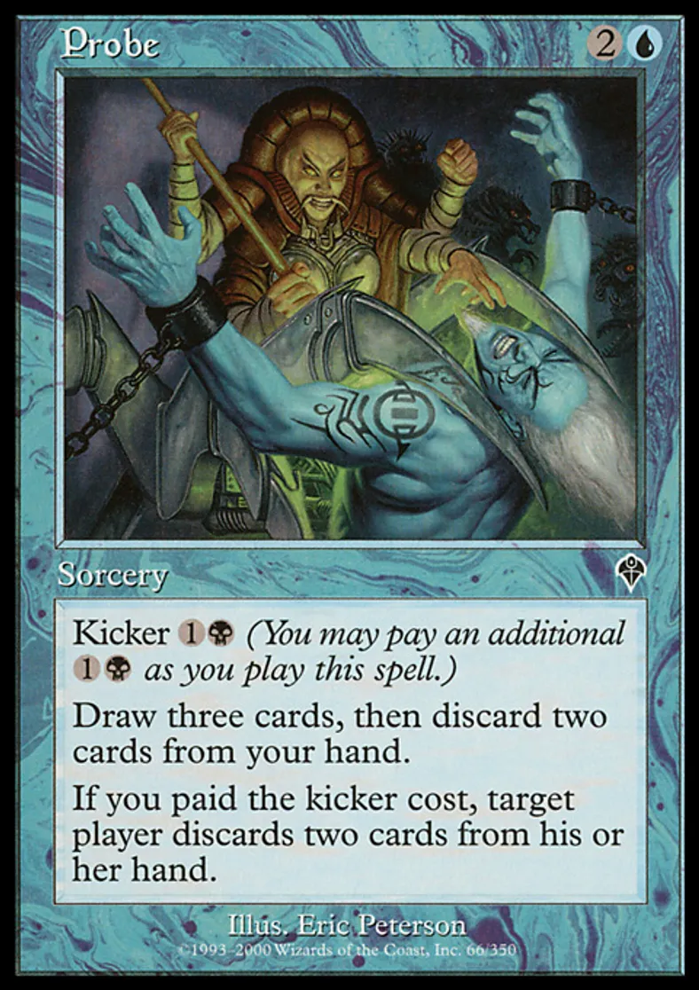 | Oracle Text | Kicker {{1}}{{b}} (You may pay an additional {{1}}{{b}} as you cast this spell.) Draw three cards, then discard two cards. If Probe was kicked, target player discards two cards. | ||