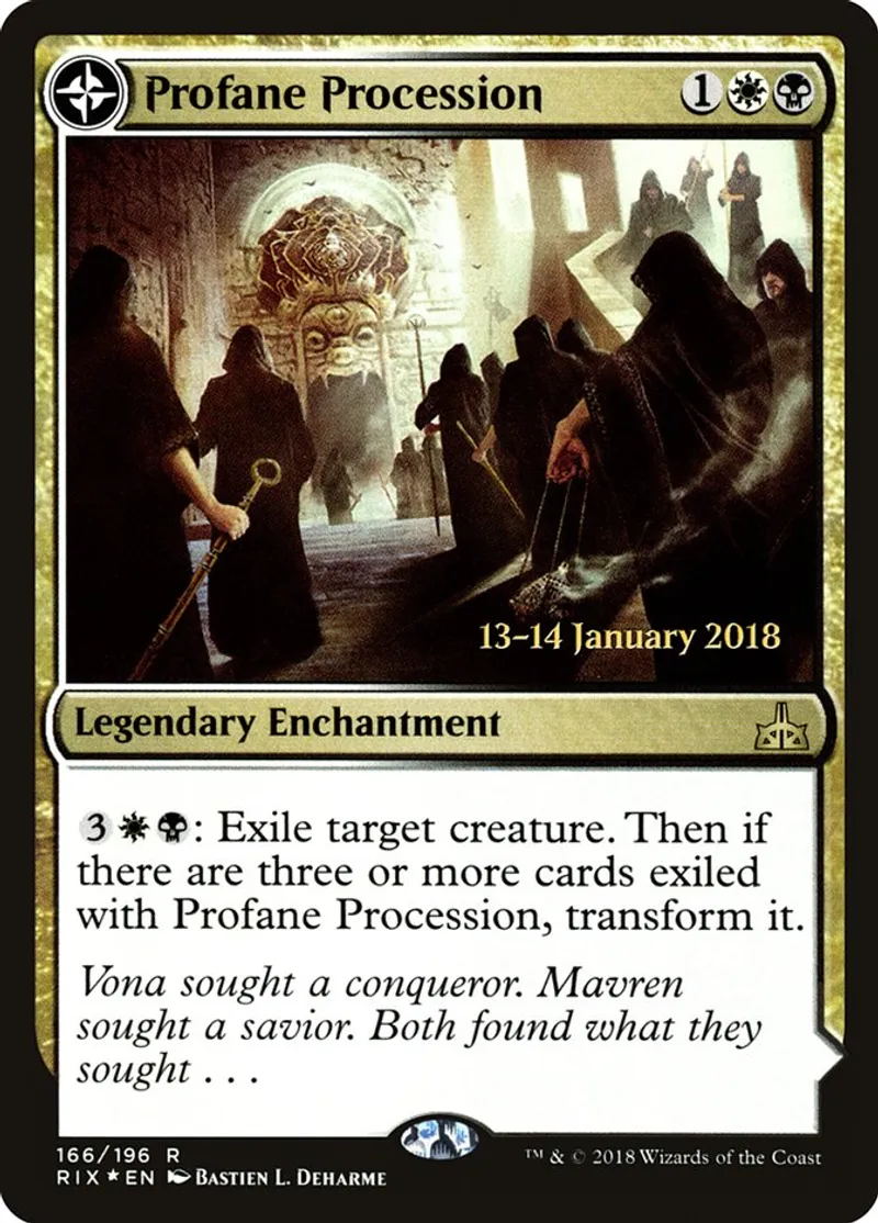 | Oracle Text | {{3}}{{W}}{{B}}: Exile target creature. Then if there are three or more cards exiled with Profane Procession, transform it. | ||