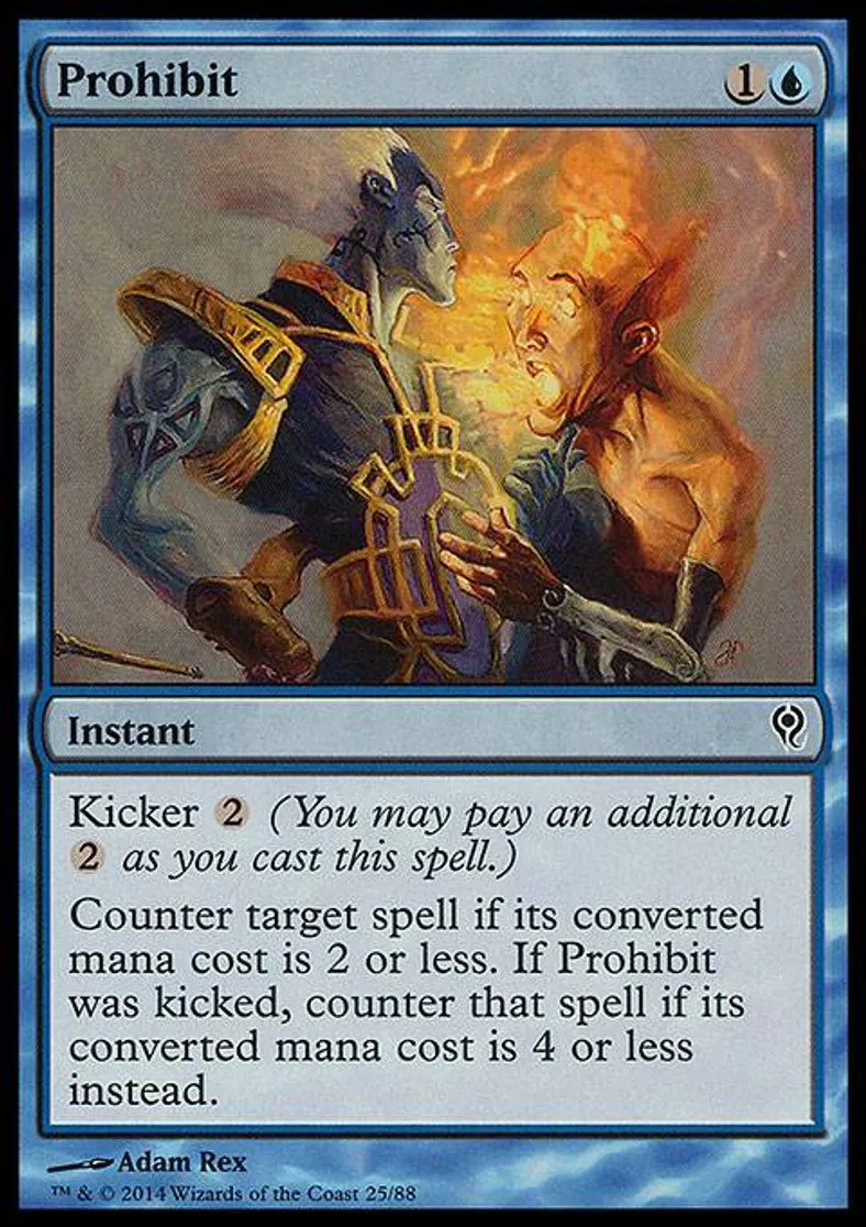 Counter target spell if its converted mana cost is 2 or less. If Prohibit was kicked, counter that spell if its converted mana cost is 4 or less instead. | ||