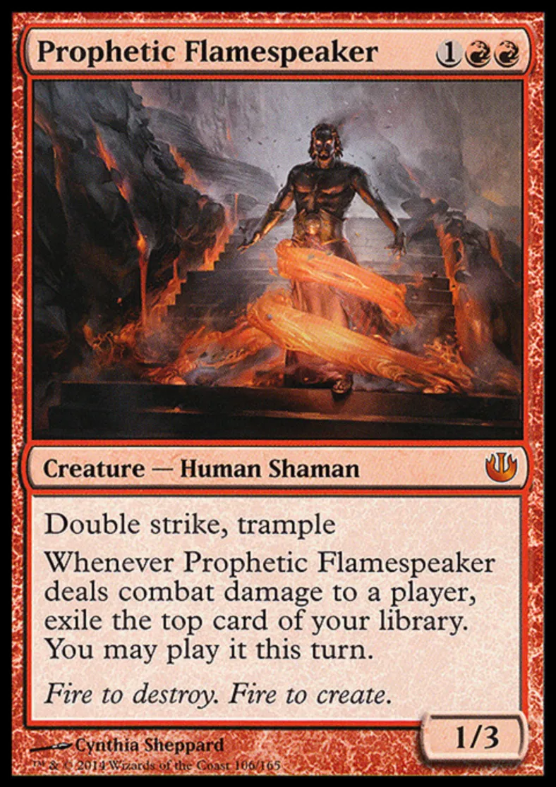 | Oracle Text | Double strike, trample Whenever Prophetic Flamespeaker deals combat damage to a player, exile the top card of your library. You may play it this turn. | ||