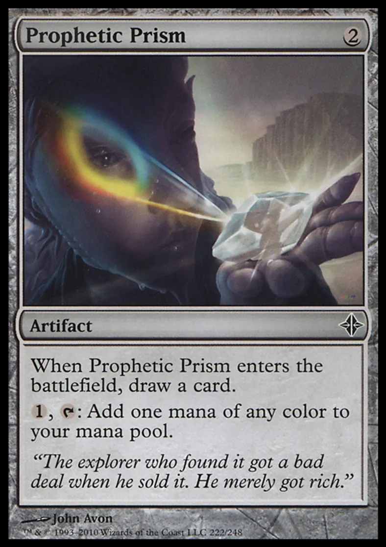| Oracle Text | When Prophetic Prism enters the battlefield, draw a card. {{1}}, {{t}}: Add one mana of any color to your mana pool. | ||