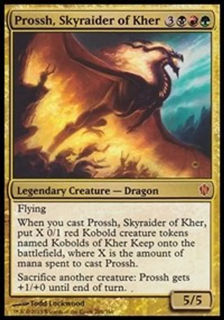| Oracle Text | Flying When you cast Prossh, Skyraider of Kher, put X 0/1 red Kobold creature tokens named Kobolds of Kher Keep onto the battlefield, where X is the amount of mana spent to cast Prossh. Sacrifice another creature: Prossh gets +1/+0 until end of turn. | ||