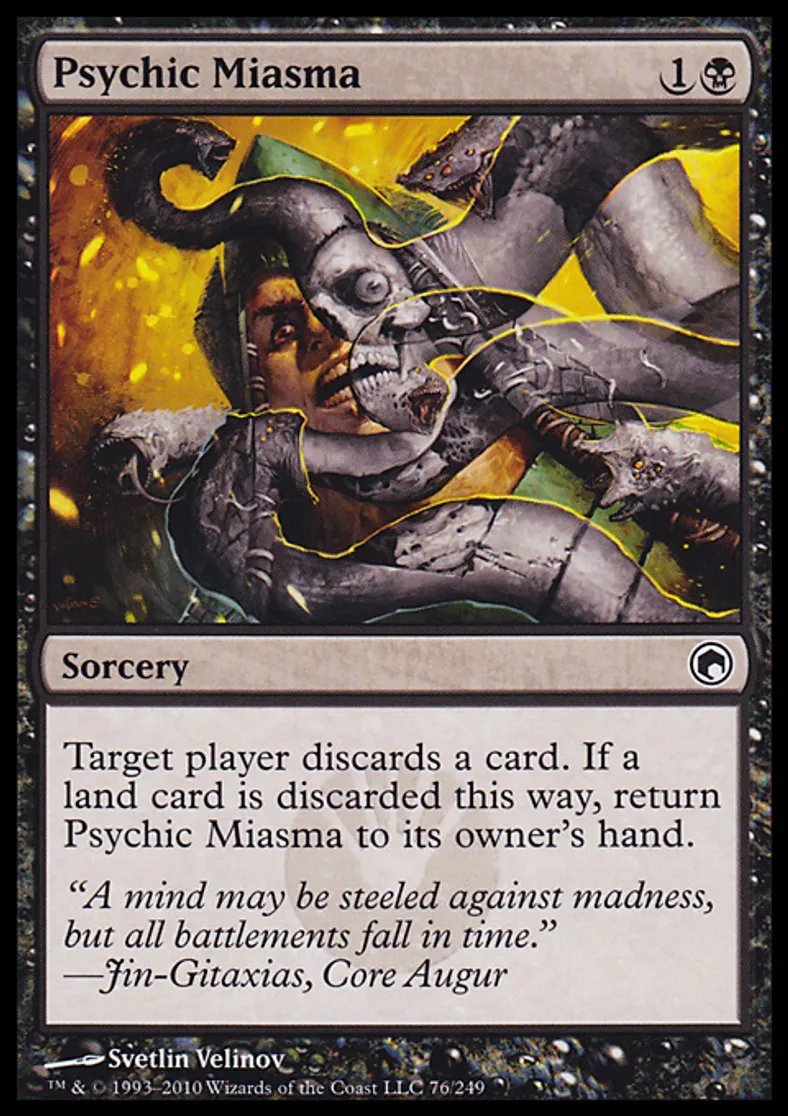 | Oracle Text | Target player discards a card. If a land card is discarded this way, return Psychic Miasma to its owner's hand. | ||