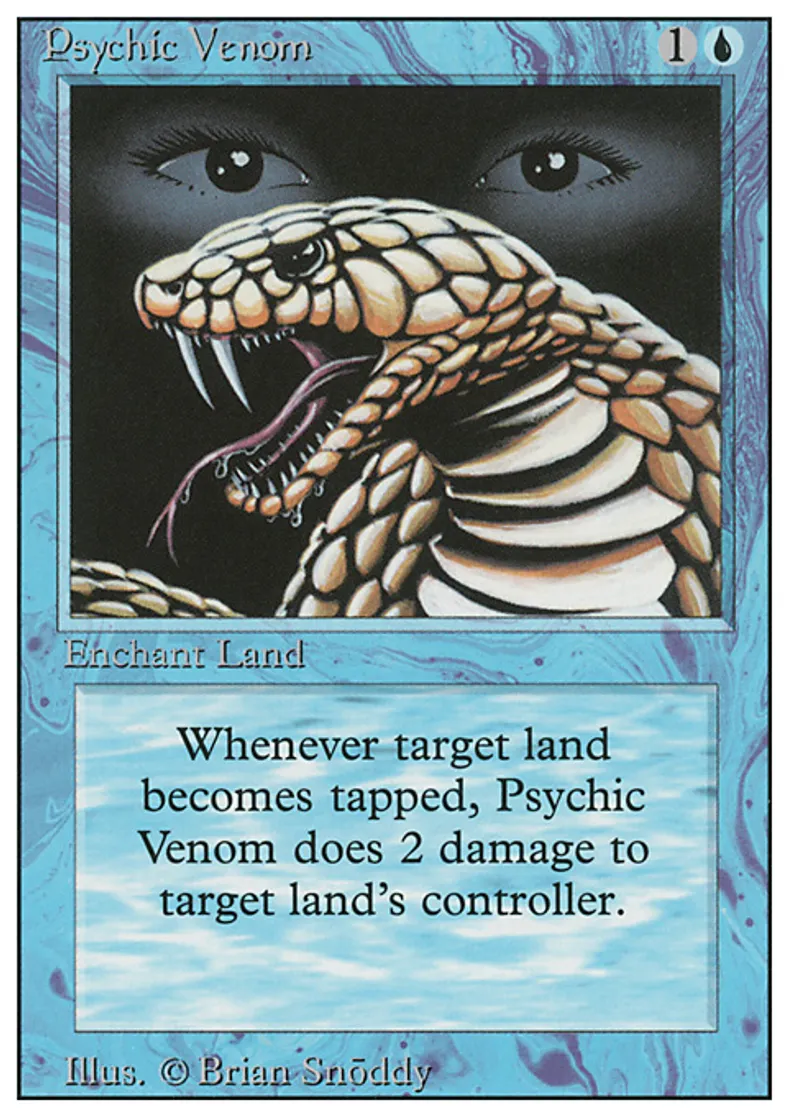 | Oracle Text | Enchant land Whenever enchanted land becomes tapped, Psychic Venom deals 2 damage to that land's controller. | ||