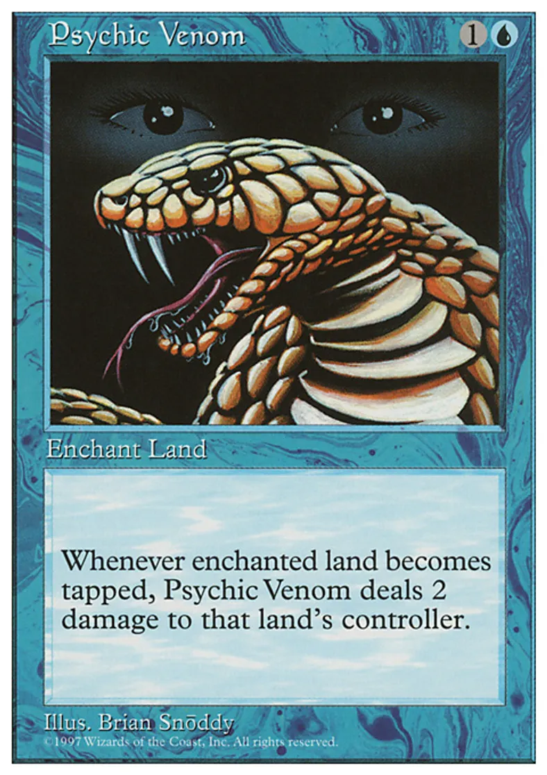 | Oracle Text | Enchant land Whenever enchanted land becomes tapped, Psychic Venom deals 2 damage to that land's controller. | ||