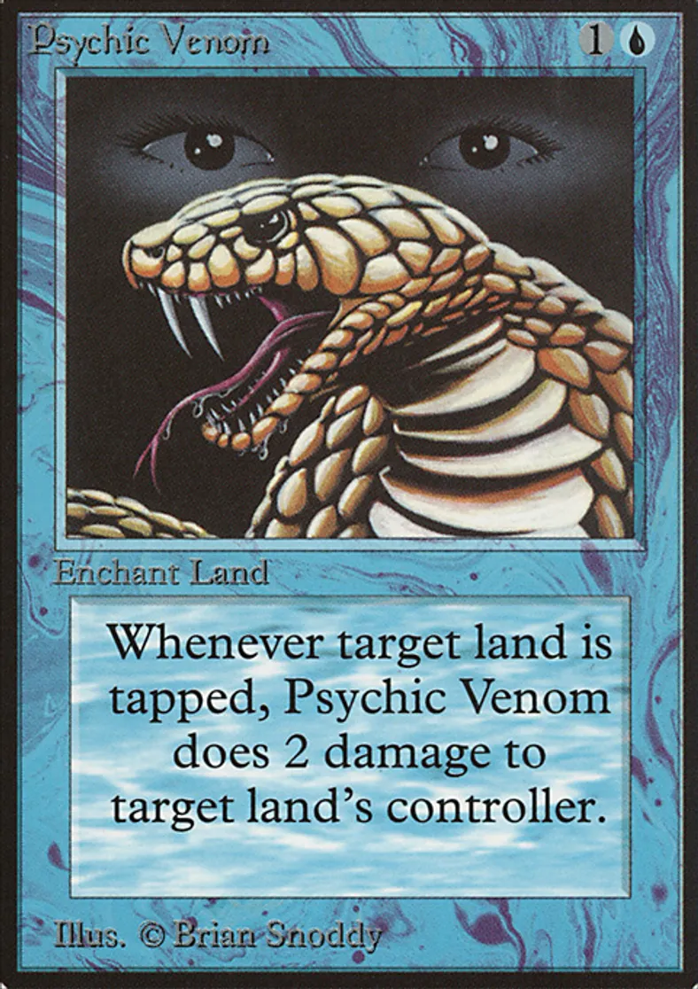 | Oracle Text | Enchant land Whenever enchanted land becomes tapped, Psychic Venom deals 2 damage to that land's controller. | ||
