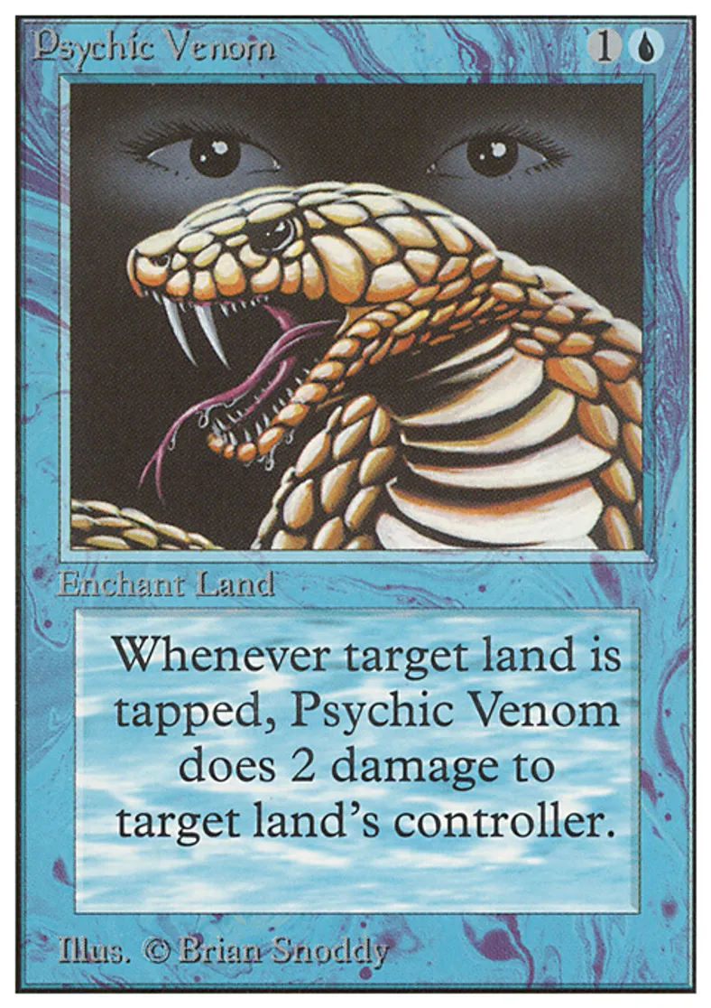 | Oracle Text | Enchant land Whenever enchanted land becomes tapped, Psychic Venom deals 2 damage to that land's controller. | ||