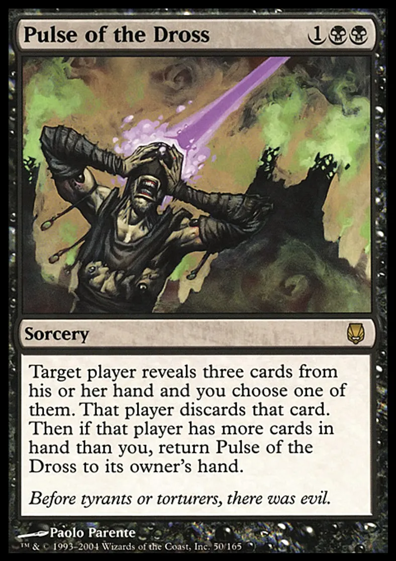 | Oracle Text | Target player reveals three cards from his or her hand and you choose one of them. That player discards that card. Then if that player has more cards in hand than you, return Pulse of the Dross to its owner's hand. | ||