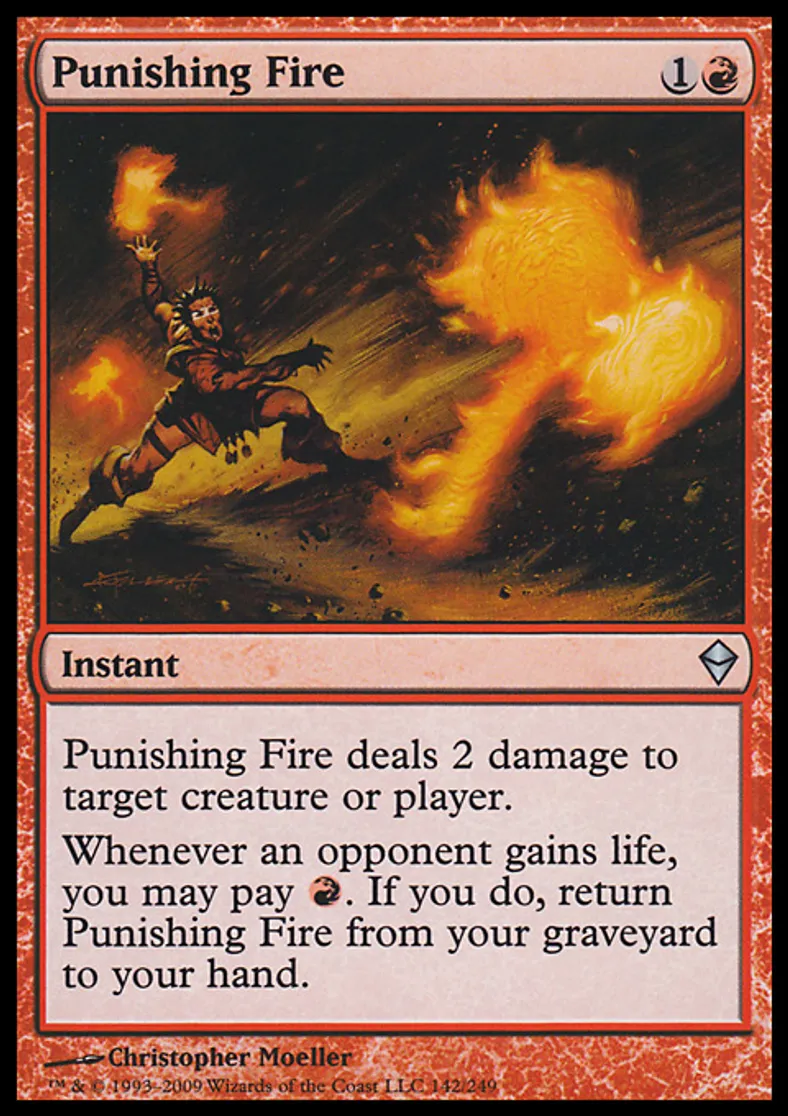 | Oracle Text | Punishing Fire deals 2 damage to target creature or player. Whenever an opponent gains life, you may pay {{r}}. If you do, return Punishing Fire from your graveyard to your hand. | ||