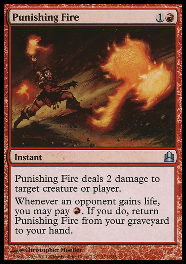 | Oracle Text | Punishing Fire deals 2 damage to target creature or player. Whenever an opponent gains life, you may pay {{r}}. If you do, return Punishing Fire from your graveyard to your hand. | ||