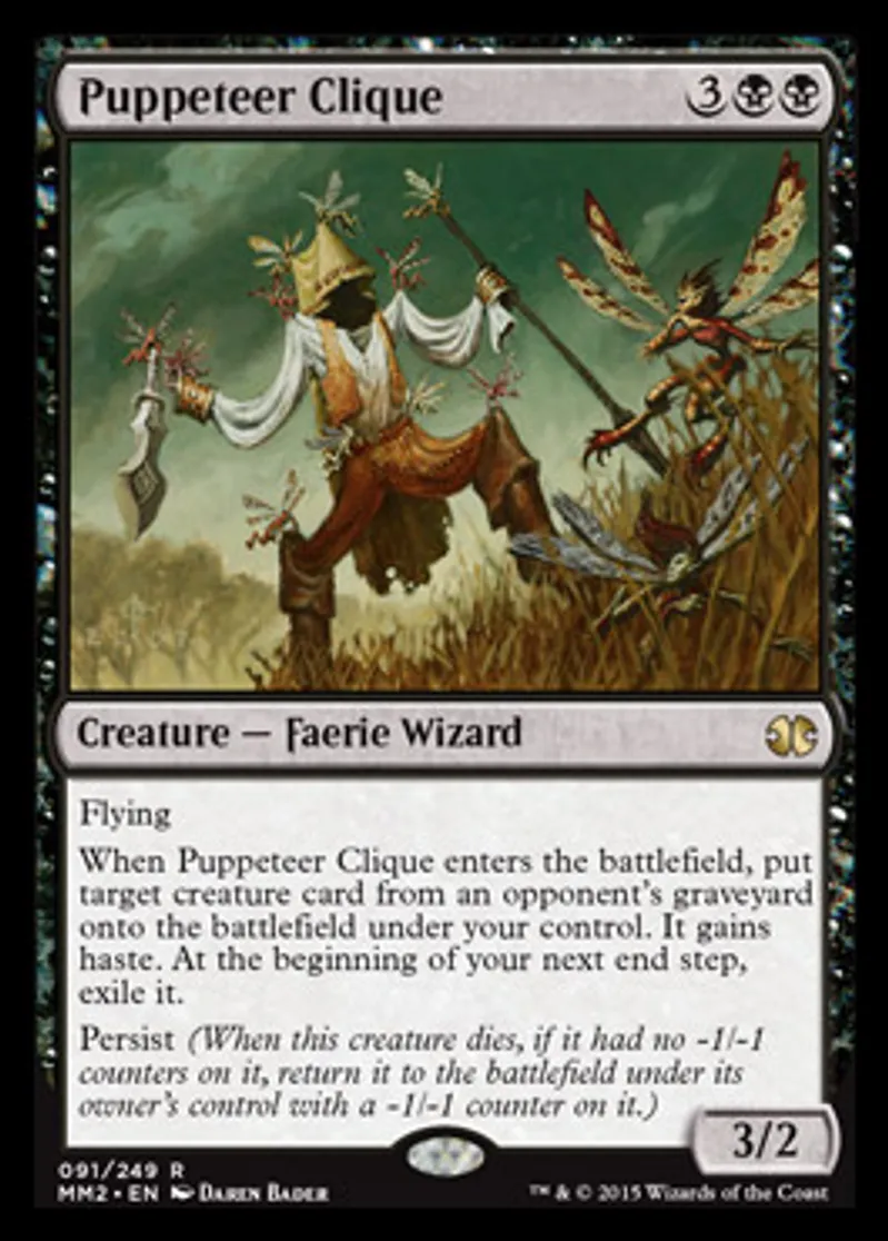 | Oracle Text | Flying When Puppeteer Clique enters the battlefield, put target creature card from an opponent's graveyard onto the battlefield under your control. It gains haste. At the beginning of your next end step, exile it. Persist (When this creature dies, if it had no -1/-1 counters on it, return it to the battlefield under its owner's control with a -1/-1 counter on it.) | ||