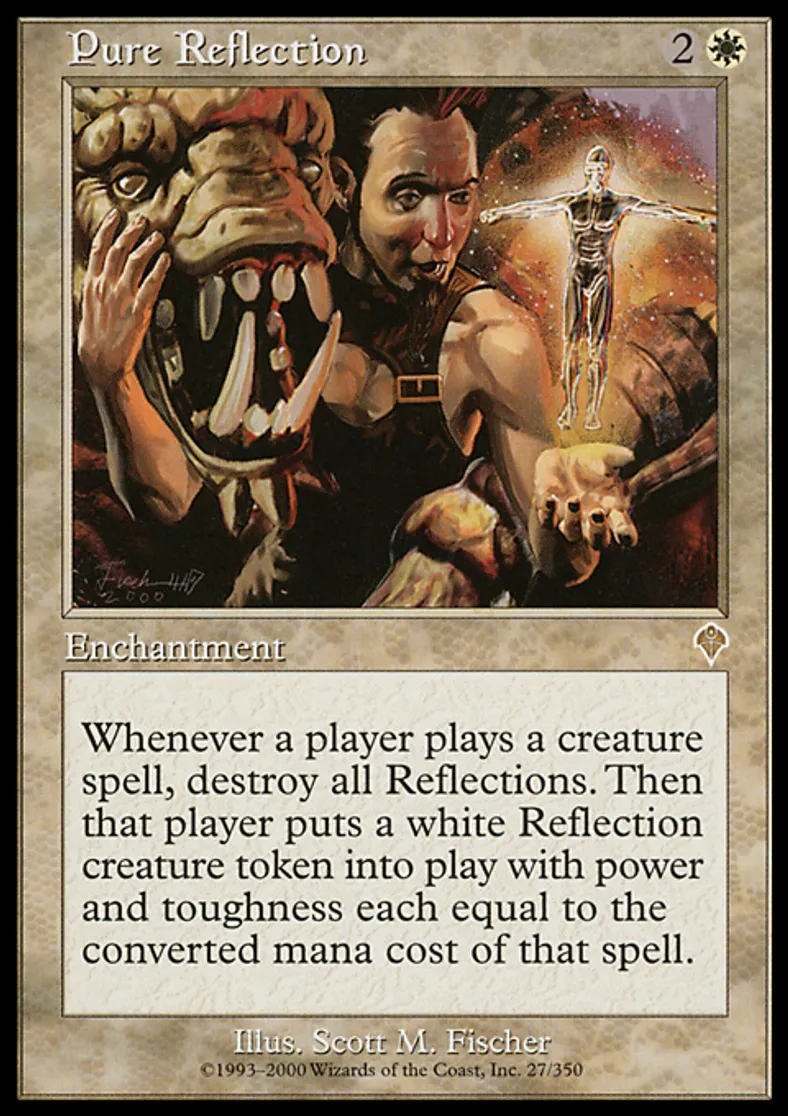 | Oracle Text | Whenever a player casts a creature spell, destroy all Reflections. Then that player puts an X/X white Reflection creature token onto the battlefield, where X is the converted mana cost of that spell. | ||