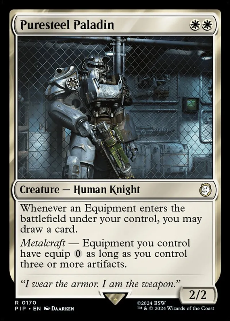 Puresteel Paladin is a rare in the set Universes Beyond: Fallout.
