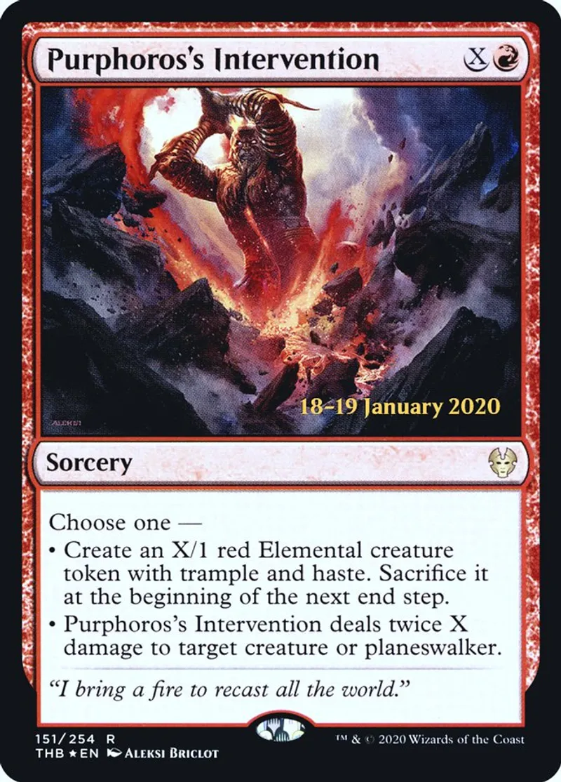 • Purphoros’s Intervention deals twice X damage to target creature or planeswalker. | ||