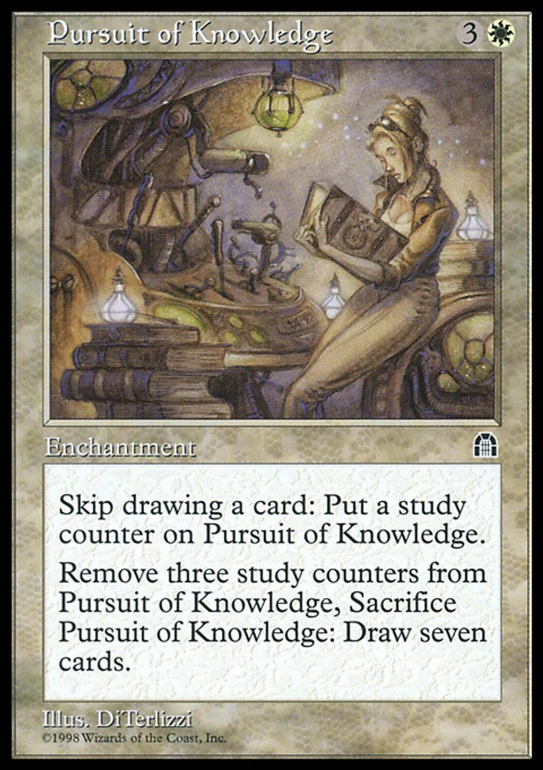 | Oracle Text | If you would draw a card, you may put a study counter on Pursuit of Knowledge instead. Remove three study counters from Pursuit of Knowledge, Sacrifice Pursuit of Knowledge: Draw seven cards. | ||