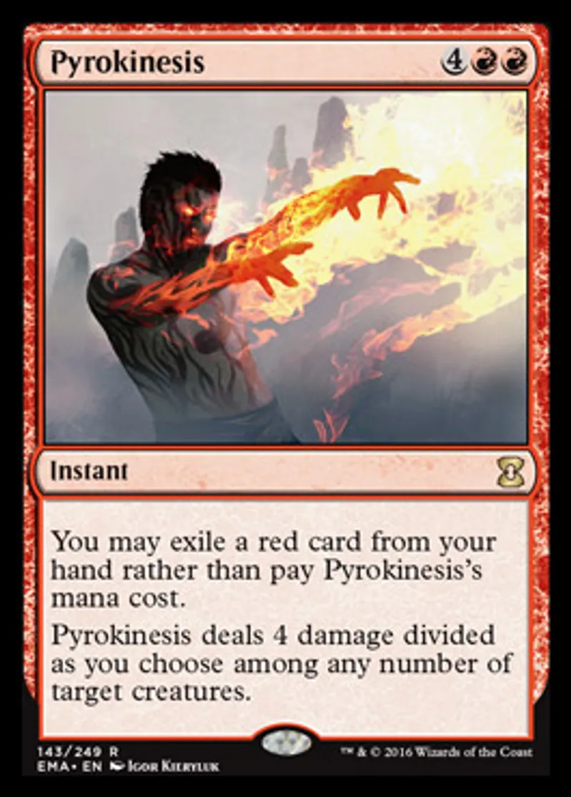 | Oracle Text | You may exile a red card from your hand rather than pay Pyrokinesis's mana cost. Pyrokinesis deals 4 damage divided as you choose among any number of target creatures. | ||