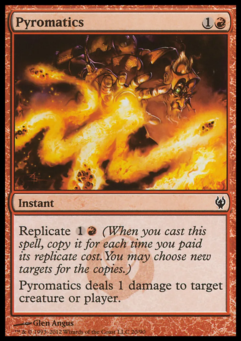 | Oracle Text | Replicate {{1}}{{r}} (When you cast this spell, copy it for each time you paid its replicate cost. You may choose new targets for the copies.) Pyromatics deals 1 damage to target creature or player. | ||