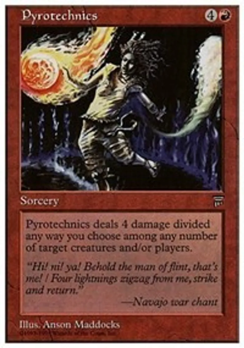 | Oracle Text | Pyrotechnics deals 4 damage divided any way you choose among any number of target creatures and/or players. | ||