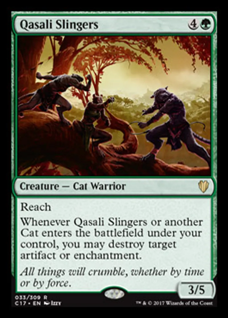 | Oracle Text | Reach Whenever Qasali Slingers or another Cat enters the battlefield under your control, you may destroy target artifact or enchantment. | ||