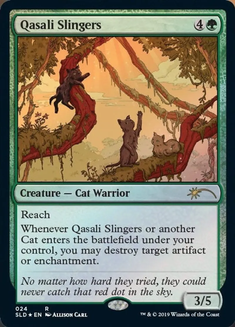 Whenever Qasali Slingers or another Cat enters the battlefield under your control, you may destroy target artifact or enchantment. | ||