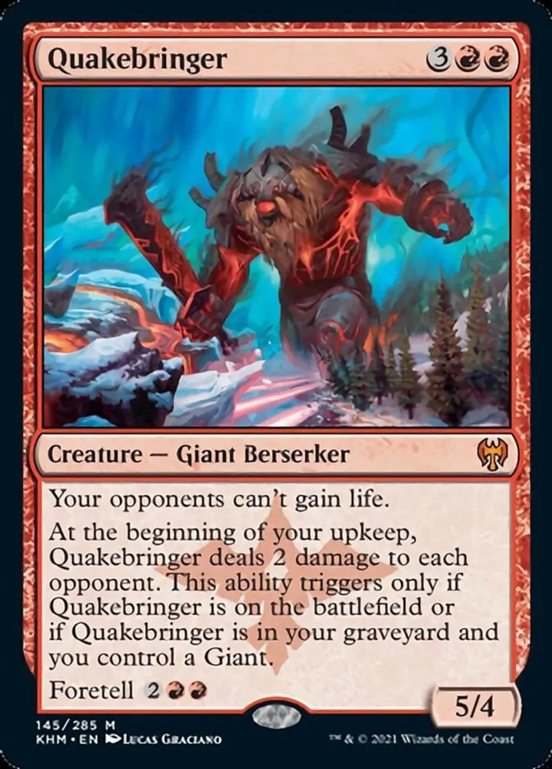 At the beginning of your upkeep, Quakebringer deals 2 damage to each opponent. This ability triggers only if Quakebringer is on the battlefield or if Quakebringer is in your graveyard and you control a Giant.