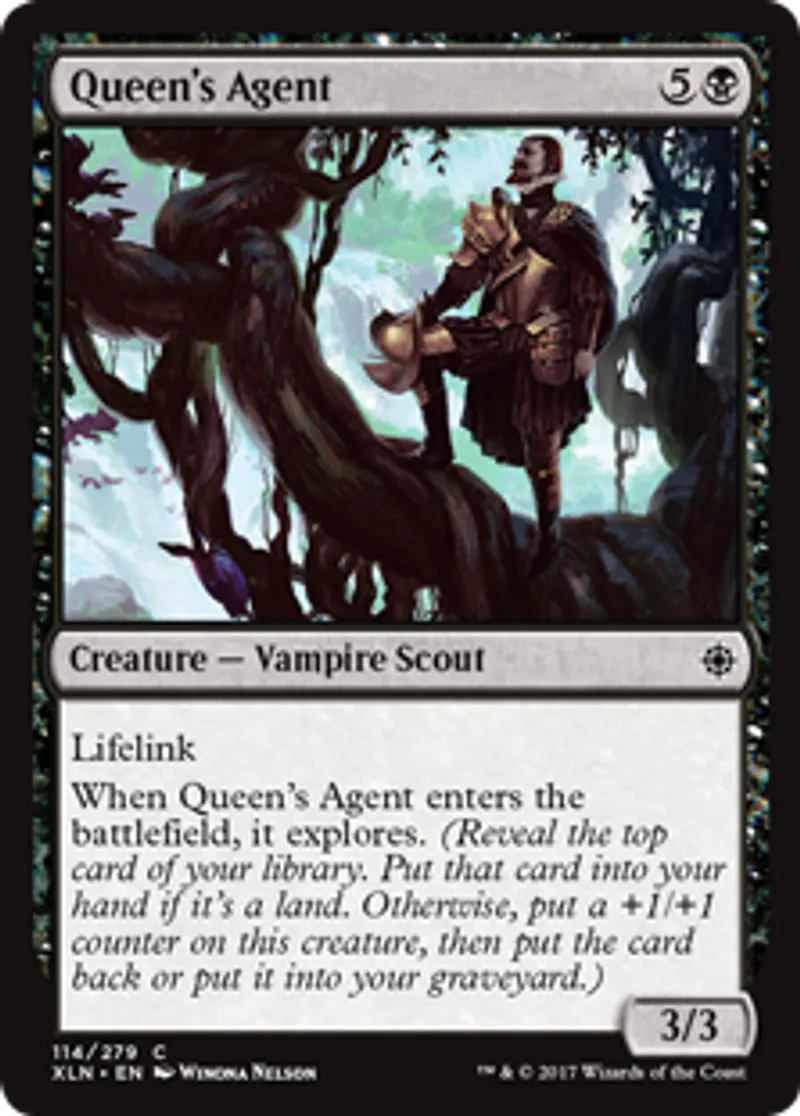 | Oracle Text | Lifelink When Queen's Agent enters the battlefield, it explores. (Reveal the top card of your library. Put that card into your hand if it's a land. Otherwise, put a +1/+1 counter on this creature, then put the card back or put it into your graveyard.) | ||