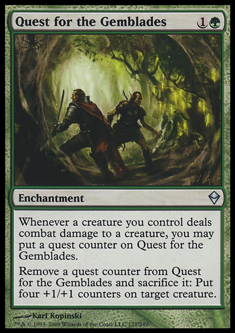 | Oracle Text | Whenever a creature you control deals combat damage to a creature, you may put a quest counter on Quest for the Gemblades. Remove a quest counter from Quest for the Gemblades and sacrifice it: Put four +1/+1 counters on target creature. | ||
