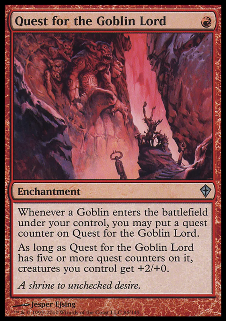 | Oracle Text | Whenever a Goblin enters the battlefield under your control, you may put a quest counter on Quest for the Goblin Lord. As long as Quest for the Goblin Lord has five or more quest counters on it, creatures you control get +2/+0. | ||