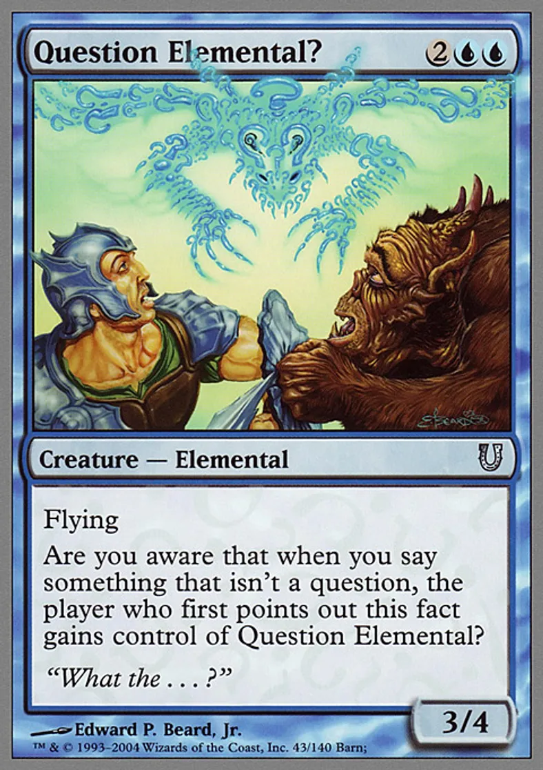 | Oracle Text | Flying Are you aware that when you say something that isn't a question, the player who first points out this fact gains control of Question Elemental? | ||