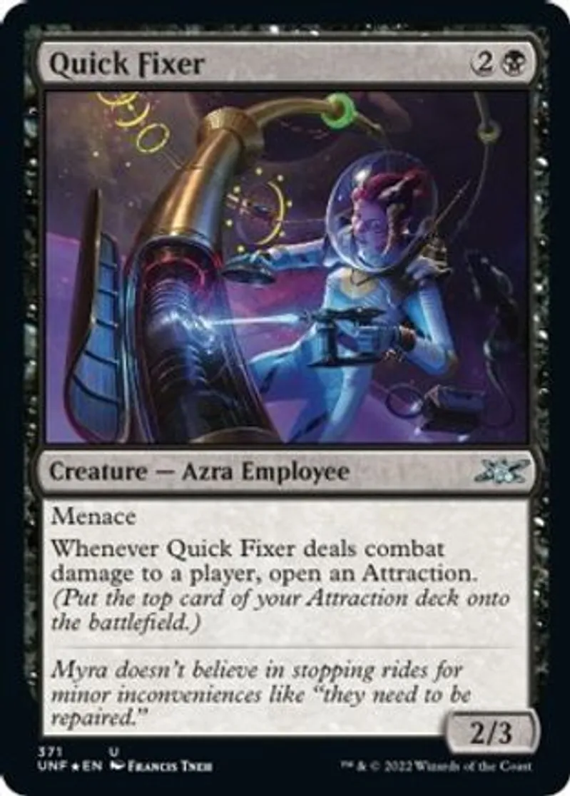 Whenever Quick Fixer deals combat damage to a player, open an Attraction. (Put the top card of your Attraction deck onto the battlefield.) | ||