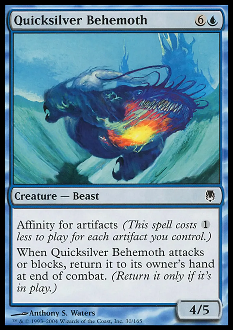 | Oracle Text | Affinity for artifacts (This spell costs {{1}} less to cast for each artifact you control.) When Quicksilver Behemoth attacks or blocks, return it to its owner's hand at end of combat. (Return it only if it's on the battlefield.) | ||