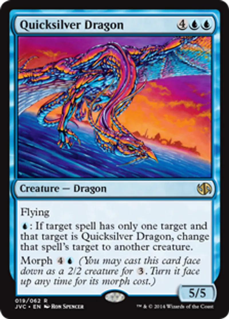 | Oracle Text | Flying {{u}}: If target spell has only one target and that target is Quicksilver Dragon, change that spell's target to another creature. Morph {{4}}{{u}} (You may cast this card face down as a 2/2 creature for {{3}}. Turn it face up any time for its morph cost.) | ||