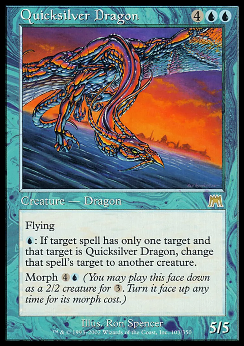 | Oracle Text | Flying {{u}}: If target spell has only one target and that target is Quicksilver Dragon, change that spell's target to another creature. Morph {{4}}{{u}} (You may cast this face down as a 2/2 creature for {{3}}. Turn it face up any time for its morph cost.) | ||