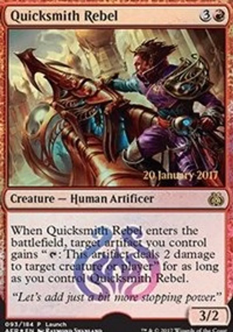 | Oracle Text | When Quicksmith Rebel enters the battlefield, target artifact you control gains "{{t}} : This artifact deals 2 damage to target creature or player" for as long as you control Quicksmith Rebel. | ||